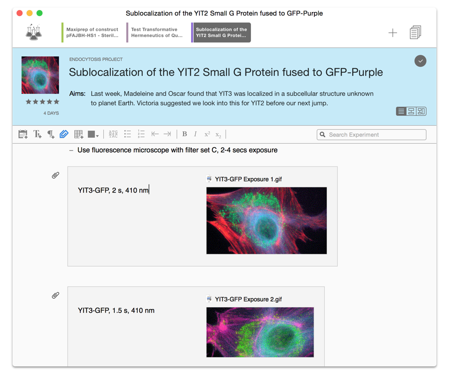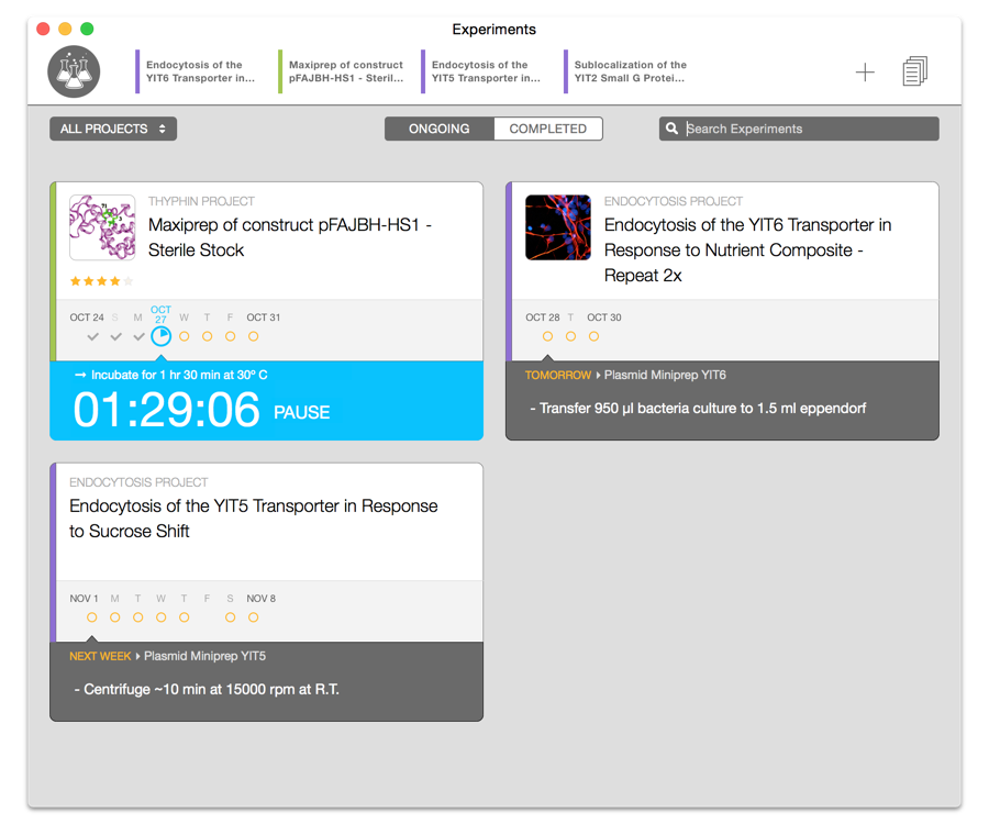 Completed experiments. Once finished, your results are safely stored alongside your notes and the protocols you used.