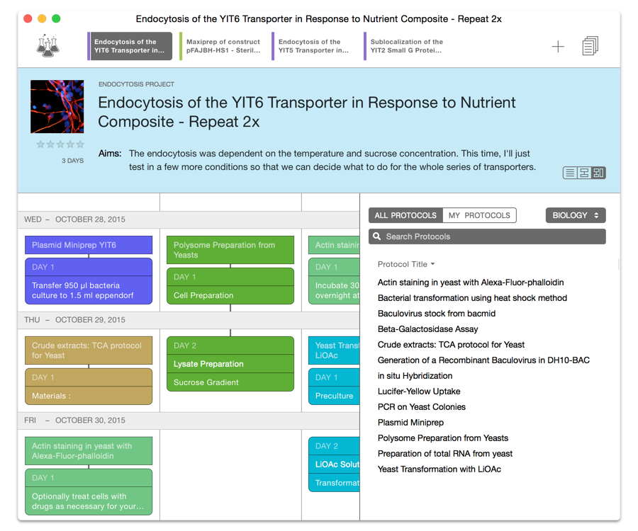 Protocols and experiments. Protocols are the primary building blocks of your experiments. You can drag them into the calendar view of an experiment and combine them in any way you need. Once integrated into an experiment, a copy of your protocol is made, so you can modify it just for that one use, and leave the original untouched.