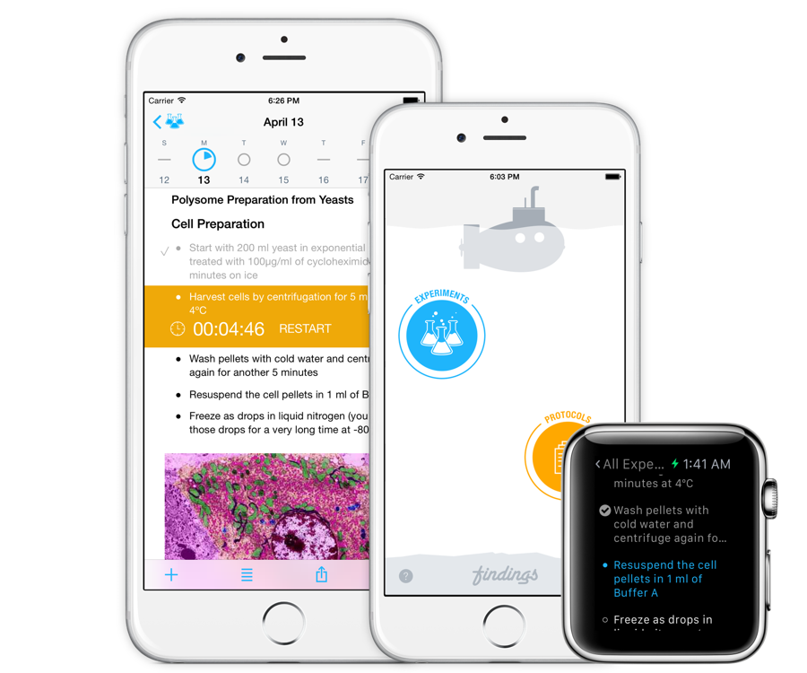 Apple Watch. It feels like Apple designed the Watch just so that Findings could run on it. How could it not be true, when Findings feels so much at home on that new screen? On Apple Watch, Findings focuses on the current day’s activities, and your running timers. Get through your experiments with just a few taps and with a new sense of accomplishment.