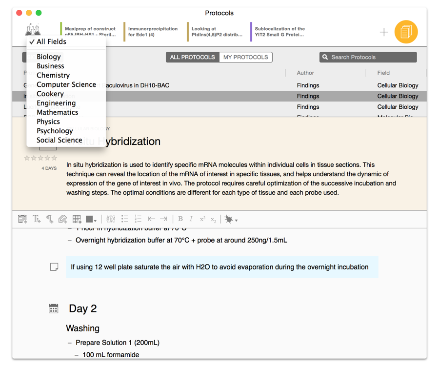 Protocol library. Protocols have a special place in Findings, where you can browse, edit, and organize them. They are easy to share with others in the lab, or with the rest of the world.